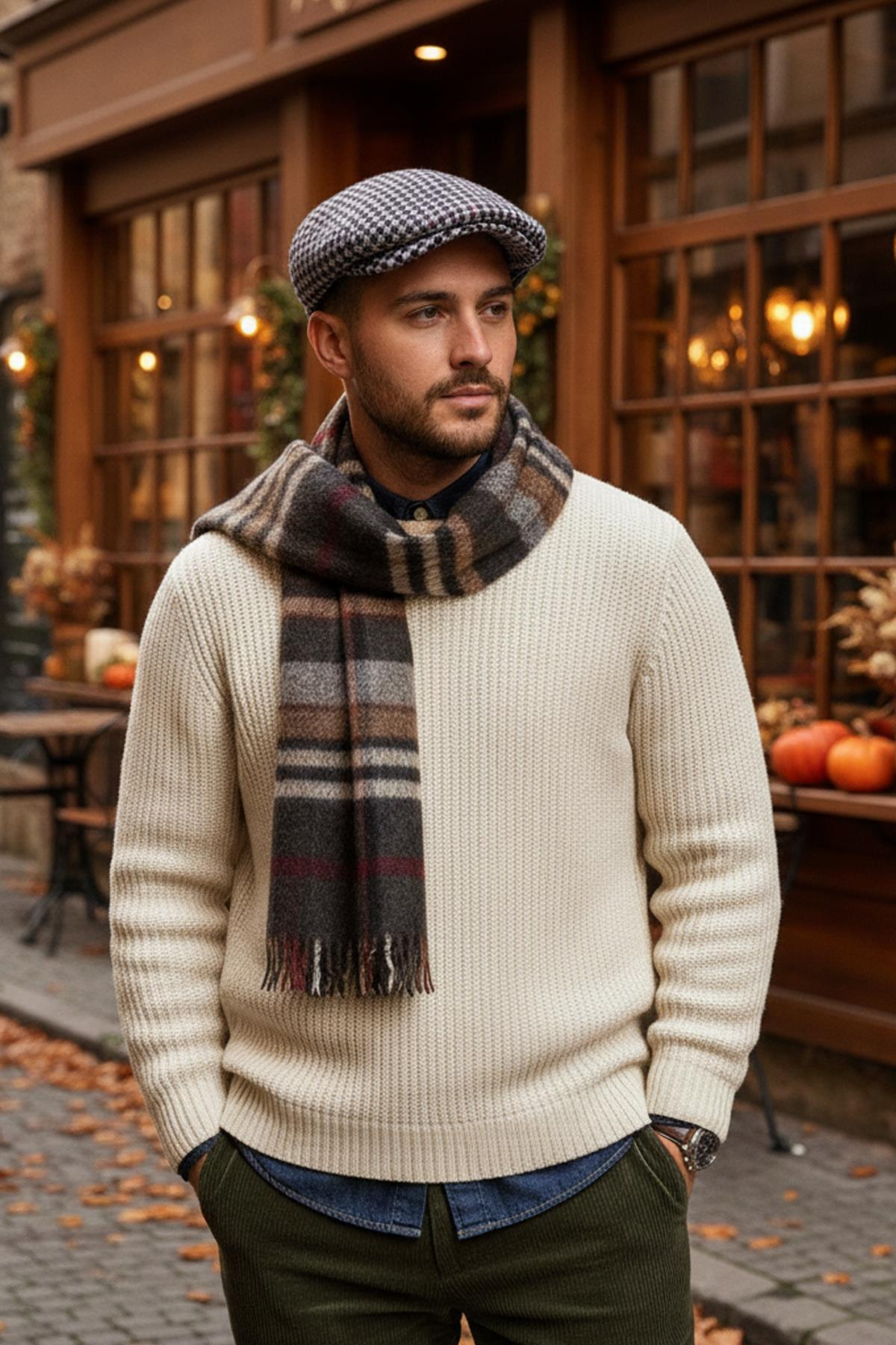 Külah Erkek Kazayağı Kasket Şapka – Ekru Desenli Retro Flat Cap KLH7549