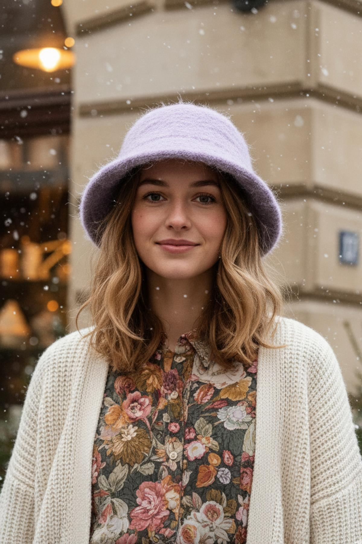 Lüks Alpaka Yün Kova Şapka - Lila Kışlık Boho Bucket Hat (KLH7548)
